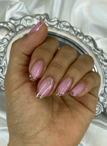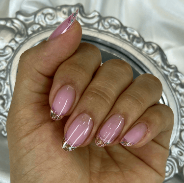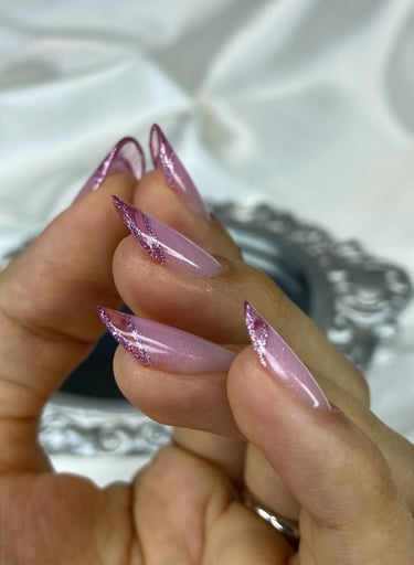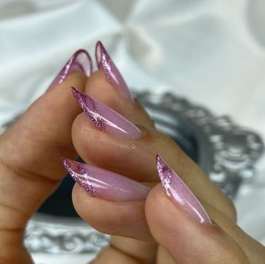 Reversa transparente com ponta vitral rosa delineada com glitter